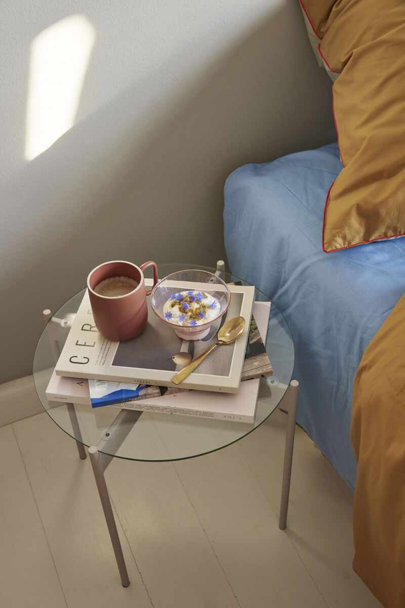 Dette smukke bord er noget for sig. Bordets glasplade leger formmæssigt så fint med det sandfarvede understel. Kombinationen er et florlet og stramt udtryk på en og samme tid. Lad bordet komme til sin ret uden pynt eller giv den gas med grupperinger af vaser eller stager.