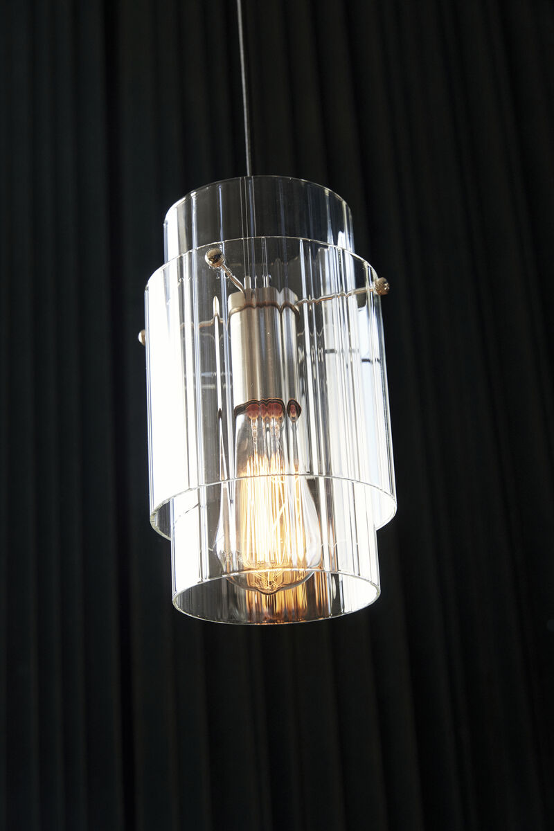 Denne lampe har et moderne og stilfuldt look. Glassets udformning skaber et elegant design. Anbring lampen i ethvert rum for en iøjnefaldende effekt. Lampen er lavet af glas og nikkel.
