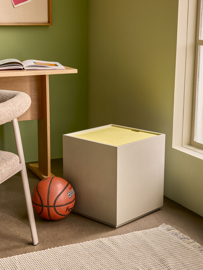 Oplev et kreativt multifunktionelt accent med vores Vault Sidebord/Opbevaringskasse. Lavet af FSC-certificeret asketræ, er dette produkt ikke kun miljøvenligt, men også holdbart og stilfuldt. Den grå/gule farvevariant tilføjer et unikt touch til ethvert rum. Brug det som ekstra opbevaringsplads i entreen eller på børneværelset. Tilgængelig i to andre farvevariationer, er dette sidebord/opbevaringskasse en æstetisk designperle, der passer perfekt ind i ethvert hjem.