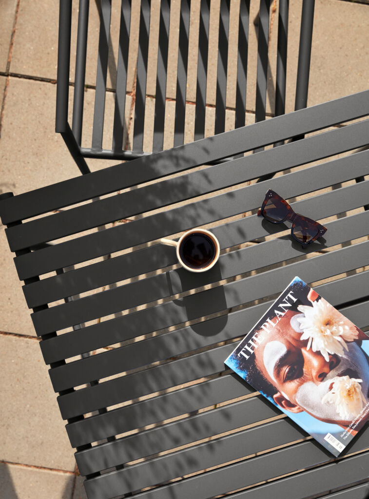 Denne sorte stol i metal passer perfekt til vores andre udendørsmøbler, men kan også pynte din altan eller terrasse alene.