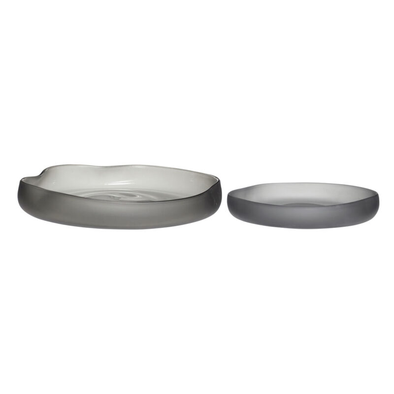 Die Schalen bestehen aus grauem Rauchglas und sind in zwei Formen und Größen erhältlich. Das Glas hat eine mattierte Oberfläche, die eine bestimmte Textur liefert. Die organischen Formen sind sehr modern und einzigartig. Die Schalen eignen sich gut für Obst oder Brötchen an einem entspannten Sonntagmorgen. Dieses Produkt ist handgefertigt und kann daher variieren.