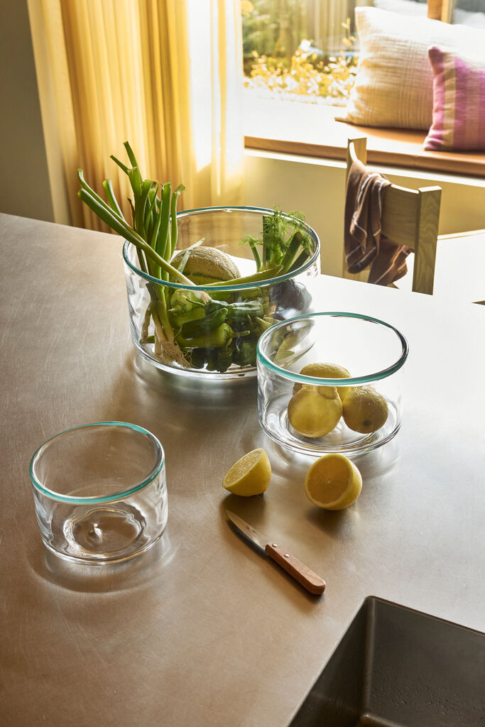 Verrerie avec une touche originale — littéralement. Le Clea Bol en verre transparent encadre vos plats avec une élégance sans effort, tandis qu’une fine ligne verte ajoute une subtile touche de couleur et la signature unique de Hübsch. Fabriqué à la main avec soin, chaque bol possède sa propre forme et son esprit unique, rendant chaque présentation personnelle. Disponible en trois variantes magnifiques, il est parfait pour mettre en valeur vos créations culinaires avec une touche artistique et un charme intemporel — que ce soit pour servir ou simplement savourer la vue.