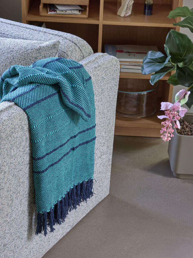 Vous recherchez un plaid qui transforme l’atmosphère de la pièce ? Le Tap Plaid apporte un contraste joyeux à votre espace avec sa base bleu-vert lumineuse et ses lignes bleu foncé audacieuses — une combinaison graphique qui dynamise tout en apaisant. Fabriqué en coton certifié OEKO-TEX® STANDARD 100, il est doux, sûr et plein de personnalité. Drapez-le sur un canapé ou gardez-le à proximité pour les soirées fraîches — c’est de la thérapie par la couleur, tissée pour le confort. Une petite œuvre d’art dans laquelle vous pouvez vous envelopper.