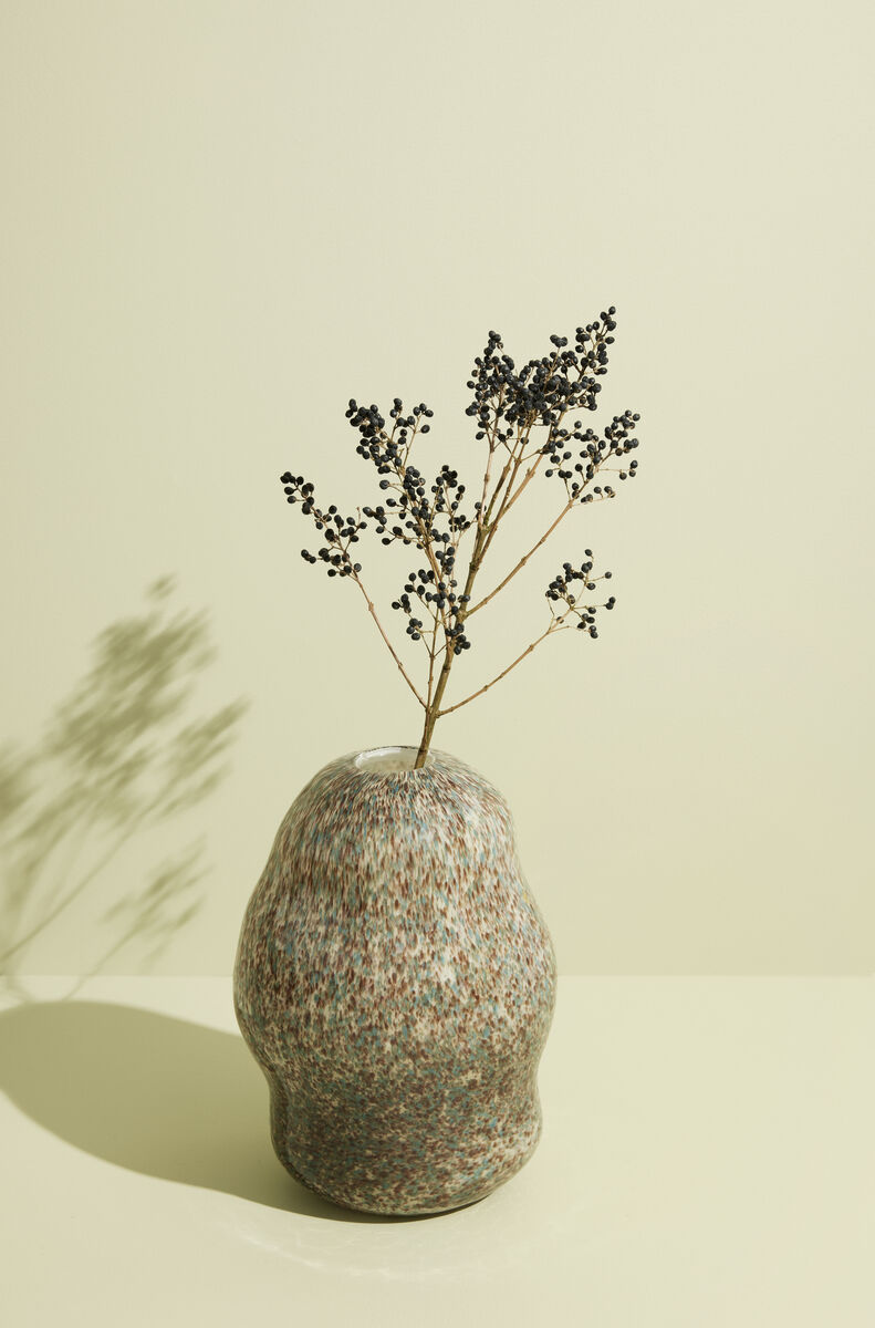 Imagine walking through the woods. The smell of damp moss, anemones, and a needle-covered path: the Miro vase is all of that in a beautiful organic shaped glass vase. You can almost get lost in the exquisite pattern of earthy muted hues. Pair this lovely vase with a bouquet of freshly cut flowers for a stunning, joyful, and gorgeous vase-flower combination.
