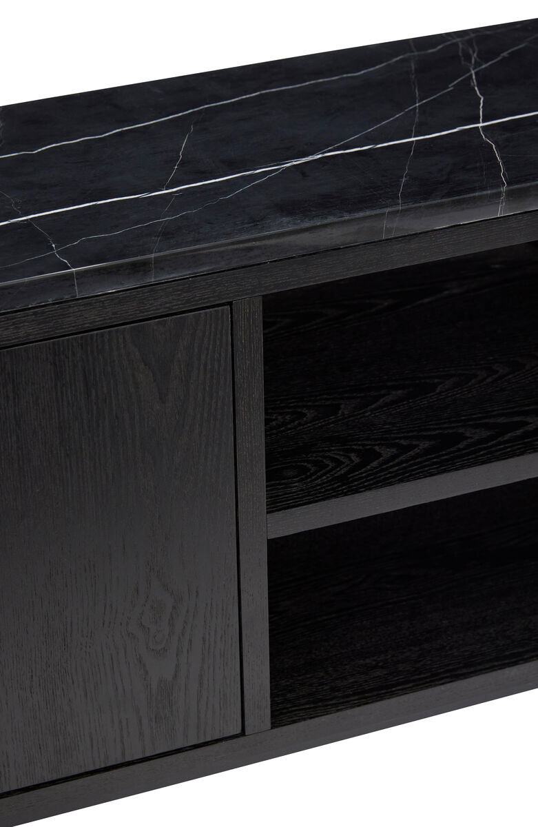 Storage furniture can often be bland. And unstylish. That’s not the case with this gorgeous low sideboard. Crafted from black FSC®-certified wood with a beautiful marble top, this piece is a real showstopper. Perfect for hiding your clutter in the small storage space while displaying some of your most beloved items, magazines, or heirlooms on the open shelf.