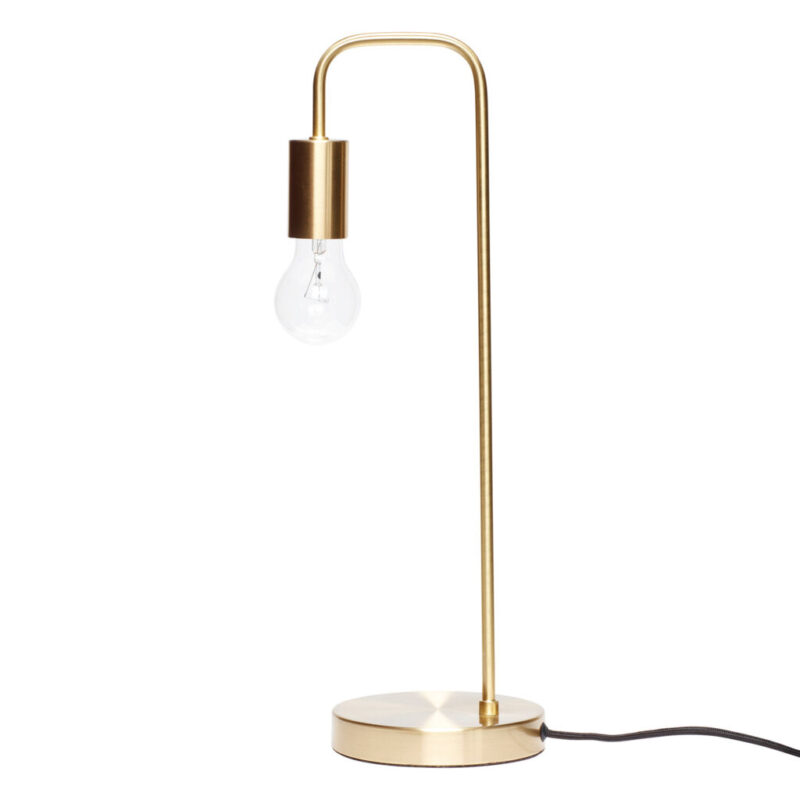 This table lamp is made from brass coloured metal. The neatly bended metal tube and cylinder shape gives the lamp an industrial appearance. The lamp can be placed on a desk or on a small dresser.